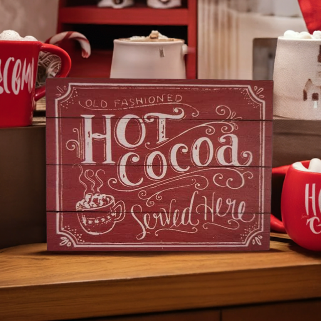 Introducing our newest addition to your home decor - the 'Old Fashioned Hot Cocoa Served Here' Red Chalk Art Block Sign. This charming sign measures 6 x 5.5 x .75 inches and is the perfect accent for the winter and Christmas holidays. Its vibrant red color and white lettering, along with simulated pallet lines, add a touch of nostalgia and warmth to any room.