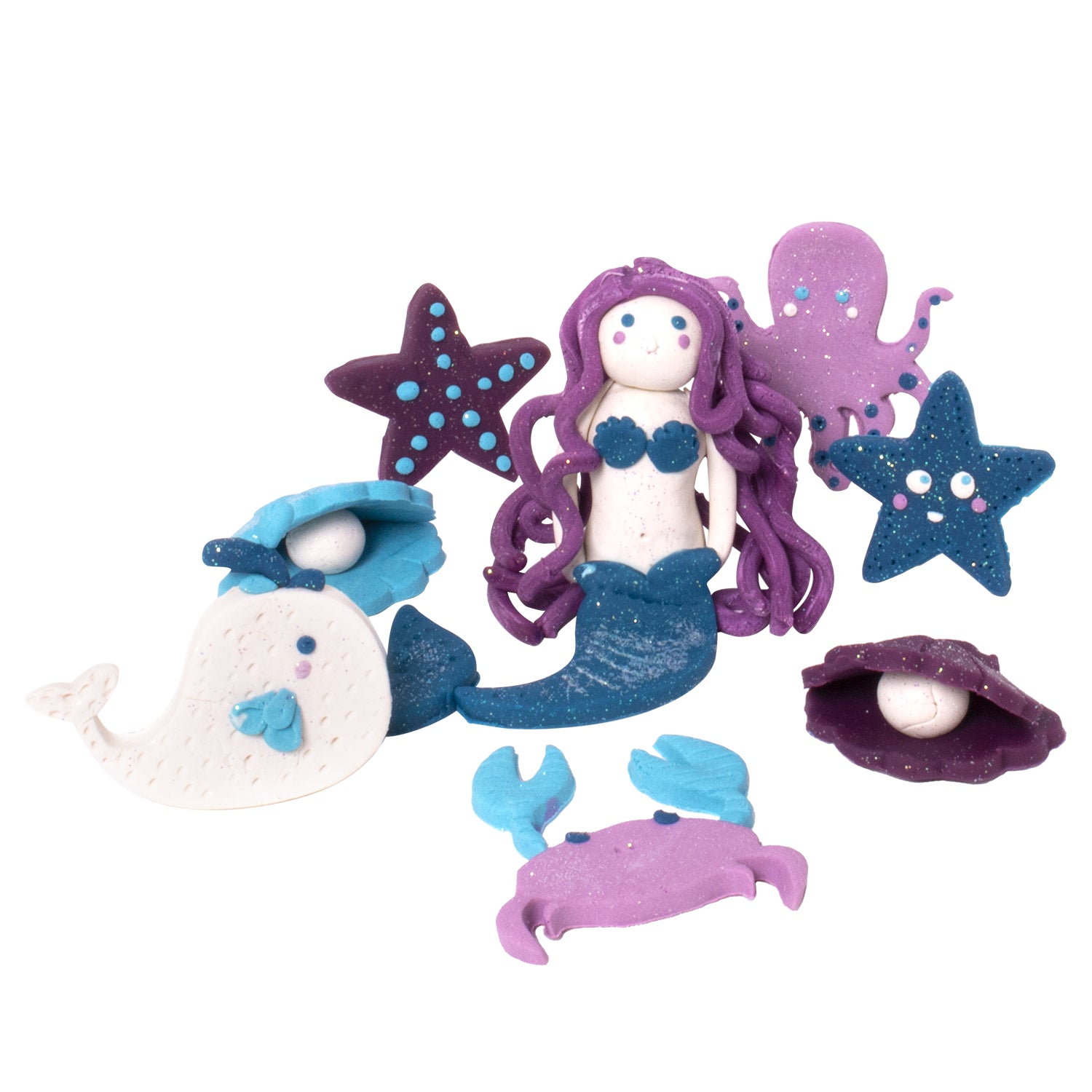 - Ocean-Themed Molds: Features 8 plastic cutout molds including clam, starfish, mermaid, dolphin, whale, octopus, and crab shapes.